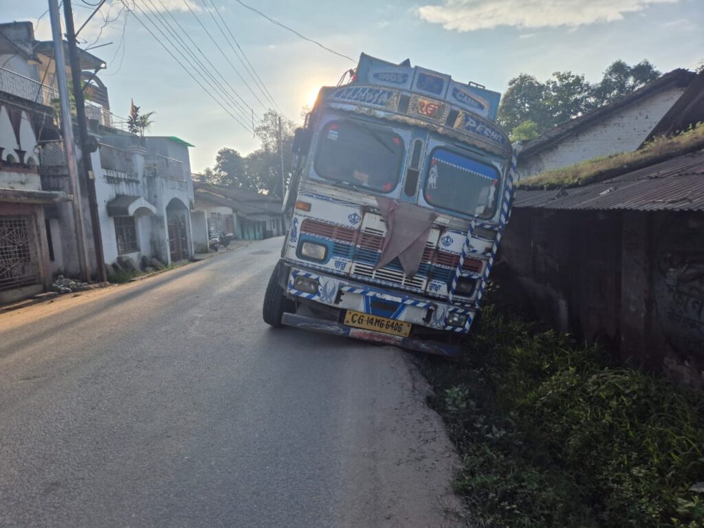 धरमजयगढ़:- धरमजयगढ़ के नीचेपारा मे आज सुबह एक सडक हादसा देखने को मिला है। इस दुर्घटना में साइड देते समय एक ट्रक रोड किनारे स्थित नाली में जा घुसी।यहां ईश्वर की दया से राहत की बात रही की किसी प्रकार की जनहानि नहीं हुई,ट्रक यदि रोड किनारे स्थित घर में घुस जाता तो बड़ी दुर्घटना घट सकती थी। बता दें यह सडक हादसा इसलिए घटित हुआ है क्युकी उक्त स्थल पर सडक बहुत ही सकरी है ,जहा एक साथ 2 गाड़ियों के आवागमन पर भी एक्सीडेंट होने का खतरा हमेशा बना रहता है।