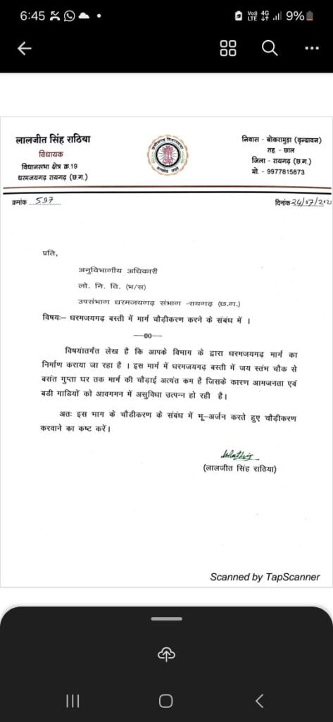 मिली जानकारी मुताबिक विधायक लालजीत ने धरमजयगढ़ नीचेपारा बस्ती में मार्ग चौड़ीकरण करने के संबंध में pwd विभाग को लेटर लिखा था कि आपके विभाग के द्वारा धरमजयगढ़ मार्ग का निर्माण कराया जा रहा है। इस मार्ग में धरमजयगढ़ बस्ती में जय स्तंभ चौक से बसंत गुप्ता घर तक मार्ग की चौड़ाई अत्यंत कम है जिसके कारण आमजनता एवं बडी गाडियों को आवगमन में असुविधा उत्पन्न हो रही है। इस भाग के चौडीकरण के संबंध में भू-अर्जन करते हुए चौड़ीकरण करवाया जाए, जिसके बाद भी अबतक कोकार्य इस सम्बन्ध में देखने को नहीं मिला है। वही लोगों के बताए अनुसार विगत 1 साल मे उक्त 100 मीटर संकरी सड़क मे लगभग आज की यह 50 वी घटना है!!