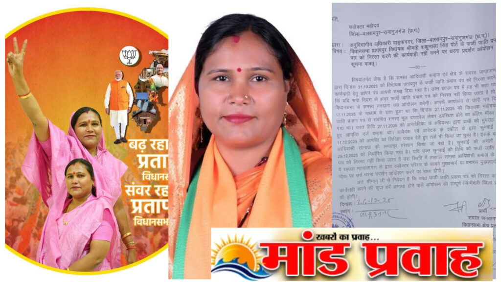 рд╡рд┐рдзрд╛рдирд╕рднрд╛ рдХреНрд╖реЗрддреНрд░ рдкреНрд░рддрд╛рдкрдкреБрд░ рд╕реЗ рднрд╛рдЬрдкрд╛ рд╡рд┐рдзрд╛рдпрдХ рд╢рдХреБрдВрддрд▓рд╛ рд╕рд┐рдВрд╣ рдкреЛрд░реНрддреЗ рдХреЗ рдХрдерд┐рдд рдлрд░реНрдЬреА рдЬрд╛рддрд┐ рдкреНрд░рдорд╛рдг рдкрддреНрд░ рдХреЛ рдирд┐рд░рд╕реНрдд рдХрд┐рдП рдЬрд╛рдиреЗ рдХреА рдорд╛рдВрдЧ рдХреЛ рд▓реЗрдХрд░ рдЖрджрд┐рд╡рд╛рд╕реА рд╕рдорд╛рдЬ рдореЗрдВ рднрд╛рд░реА рдЖрдХреНрд░реЛрд╢ рд╡реНрдпрд╛рдкреНрдд рд╣реИред рдЗрд╕ рд╕рдВрдмрдВрдз рдореЗрдВ рд╕рдорд╕реНрдд рдЖрджрд┐рд╡рд╛рд╕реА рд╕рдорд╛рдЬ рдПрд╡рдВ рдХреНрд╖реЗрддреНрд░ рдХреЗ рдирд╛рдЧрд░рд┐рдХреЛрдВ рдХреА рдУрд░ рд╕реЗ рдХрд▓реЗрдХреНрдЯрд░, рдмрд▓рд░рд╛рдордкреБрд░тАУрд░рд╛рдорд╛рдиреБрдЬрдЧрдВрдЬ рдХреЛ рдПрдХ рд▓рд┐рдЦрд┐рдд рдЖрд╡реЗрджрди рд╕реМрдВрдкрдХрд░ рдХрдбрд╝реА рдХрд╛рд░реНрд░рд╡рд╛рдИ рдирд╣реАрдВ рд╣реЛрдиреЗ рдкрд░ рдЙрдЧреНрд░ рдзрд░рдирд╛тАУрдкреНрд░рджрд░реНрд╢рди рдХреА рдЪреЗрддрд╛рд╡рдиреА рджреА рдЧрдИ рд╣реИред