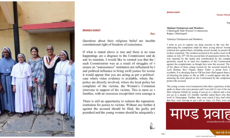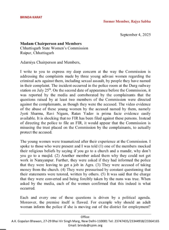рдирдИ рджрд┐рд▓реНрд▓реАред рдорд╛рд░реНрдХреНрд╕рд╡рд╛рджреА рдХрдореНрдпреБрдирд┐рд╕реНрдЯ рдкрд╛рд░реНрдЯреА рдХреЗ рдкреЛрд▓рд┐рдЯ рдмреНрдпреВрд░реЛ рдХреА рдкреВрд░реНрд╡ рд╕рджрд╕реНрдп, рдкреВрд░реНрд╡ рд░рд╛рдЬреНрдпрд╕рднрд╛ рд╕рд╛рдВрд╕рдж рдФрд░ рджреЗрд╢ рдореЗрдВ рдорд╣рд┐рд▓рд╛ рдЖрдВрджреЛрд▓рди рдХреА рдЕрдЧреНрд░рдгреА рдиреЗрддрд╛ рдмреГрдВрджрд╛ рдХрд░рд╛рдд рдиреЗ рдЫрддреНрддреАрд╕рдЧрдврд╝ рд░рд╛рдЬреНрдп рдорд╣рд┐рд▓рд╛ рдЖрдпреЛрдЧ рдХреЛ рдПрдХ рд╕рдЦреНрдд рдкрддреНрд░ рд▓рд┐рдЦрдХрд░ рдЙрд╕рдХреА рдХрд╛рд░реНрдпрдкреНрд░рдгрд╛рд▓реА рдкрд░ рд╕рд╡рд╛рд▓ рдЙрдард╛рдП рд╣реИрдВред рдпрд╣ рдкрддреНрд░ рдЫрддреНрддреАрд╕рдЧрдврд╝ рдХреЗ рджреБрд░реНрдЧ рдЬрд┐рд▓реЗ рдореЗрдВ рдШрдЯрд┐рдд рдЙрд╕ рдШрдЯрдирд╛ рдХреЗ рд╕рдВрджрд░реНрдн рдореЗрдВ рд╣реИ, рдЬрд┐рд╕рдореЗрдВ 25 рдЬреБрд▓рд╛рдИ 2025 рдХреЛ рдмрд╕реНрддрд░ рдХреНрд╖реЗрддреНрд░ рдХреЗ рдирд╛рд░рд╛рдпрдгрдкреБрд░ рдХреА рддреАрди рдЖрджрд┐рд╡рд╛рд╕реА рд▓рдбрд╝рдХрд┐рдпрд╛рдВ рдиреМрдХрд░реА рдХреА рддрд▓рд╛рд╢ рдореЗрдВ рджреЛ рдирдиреЛрдВ рдХреЗ рд╕рд╛рде рдЖрдЧрд░рд╛ рдЬрд╛ рд░рд╣реА рдереАрдВ, рд▓реЗрдХрд┐рди рджреБрд░реНрдЧ рд░реЗрд▓рд╡реЗ рд╕реНрдЯреЗрд╢рди рдкрд░ рдмрдЬрд░рдВрдЧ рджрд▓ рдХреЗ рдХрд╛рд░реНрдпрдХрд░реНрддрд╛рдУрдВ рдЙрдиреНрд╣реЗрдВ рд░реЛрдХрдХрд░ рд░реЗрд▓рд╡реЗ рдкреБрд▓рд┐рд╕ рдХреА рдореМрдЬреВрджрдЧреА рдореЗрдВ рдЙрди рдкрд░ рд╣рдорд▓рд╛ рдХрд┐рдпрд╛, рдЙрдиреНрд╣реЗрдВ рдЕрд╢реНрд▓реАрд▓ рдЧрд╛рд▓рд┐рдпрд╛рдВ рджреАрдВ рдФрд░ рдирдиреЛрдВ рдкрд░ рдЬрдмрд░рди рдзрд░реНрдорд╛рдВрддрд░рдг рдФрд░ рдорд╛рдирд╡ рддрд╕реНрдХрд░реА рдХрд╛ рдЖрд░реЛрдк рд▓рдЧрд╛рдпрд╛ рдерд╛ред рдкреБрд▓рд┐рд╕ рдиреЗ рдмрд┐рдирд╛ рдЬрд╛рдВрдЪ рдХреЗ рдирдиреЛрдВ рдФрд░ рдПрдХ рдЖрджрд┐рд╡рд╛рд╕реА рдпреБрд╡рдХ рдХреЛ рдЧрд┐рд░рдлреНрддрд╛рд░ рдХрд░ рд▓рд┐рдпрд╛ рдерд╛ред рдЗрд╕ рдШрдЯрдирд╛ рдХреА рдкреВрд░реЗ рджреЗрд╢ рдореЗрдВ рдкреНрд░рддрд┐рдХреНрд░рд┐рдпрд╛ рд╣реБрдИ рдереА рдФрд░ рдЫрддреНрддреАрд╕рдЧрдврд╝ рдФрд░ рдХреЗрд░рд▓ рд╕рд╣рд┐рдд рджреЗрд╢ рдХреЗ рд╡рд┐рднрд┐рдиреНрди рд╣рд┐рд╕реНрд╕реЛрдВ рдореЗрдВ рд╡рд┐рд░реЛрдз рдкреНрд░рджрд░реНрд╢рди рд╣реБрдП рдереЗред рд╕рдВрд╕рдж рдореЗрдВ рдкреНрд░рджрд░реНрд╢рди рдХрд░ рд╡рд┐рдкрдХреНрд╖ рдиреЗ рднрд╛рдЬрдкрд╛ рдкрд░ рдЕрд▓реНрдкрд╕рдВрдЦреНрдпрдХреЛрдВ рдХреЗ рдЕрдзрд┐рдХрд╛рд░реЛрдВ рдХреЗ рдЙрд▓реНрд▓рдВрдШрди рдХрд╛ рдЖрд░реЛрдк рд▓рдЧрд╛рдпрд╛ рдерд╛ред рдЗрд╕ рдорд╛рдорд▓реЗ рдХреА рдЬрд╛рдВрдЪ рдХреЗ рд▓рд┐рдП рд╕реНрд╡рдпрдВ рдорд╛рдХрдкрд╛ рдиреЗрддреНрд░реА рдмреГрдВрджрд╛ рдХрд░рд╛рдд рдФрд░ рдорд╛рдХрдкрд╛ рд╕рд╛рдВрд╕рдж рдЬреЙрди рдмреНрд░рд┐рдЯрд╛рд╕ рдФрд░ рдЕрдиреНрдп рд╡рд╛рдордкрдВрдереА рдиреЗрддрд╛ рджреБрд░реНрдЧ рдкрд╣реБрдВрдЪреЗ рдереЗ рдФрд░ рдЬреЗрд▓ рдореЗрдВ рдЬрд╛рдХрд░ рдирдиреЛрдВ рд╕реЗ рдореБрд▓рд╛рдХрд╛рдд рдХреА рдереАред рдХреЗрд░рд▓ рдХреЗ рднрд╛рдЬрдкрд╛ рдЕрдзреНрдпрдХреНрд╖ рдиреЗ рднреА рджреБрд░реНрдЧ рдЖрдХрд░ рд╕рдВрдШреА рд╕рдВрдЧрдардиреЛрдВ рдХреА рд╣рд░рдХрдд рдФрд░ рдЫрддреНрддреАрд╕рдЧрдврд╝ рдореЗрдВ рднрд╛рдЬрдкр