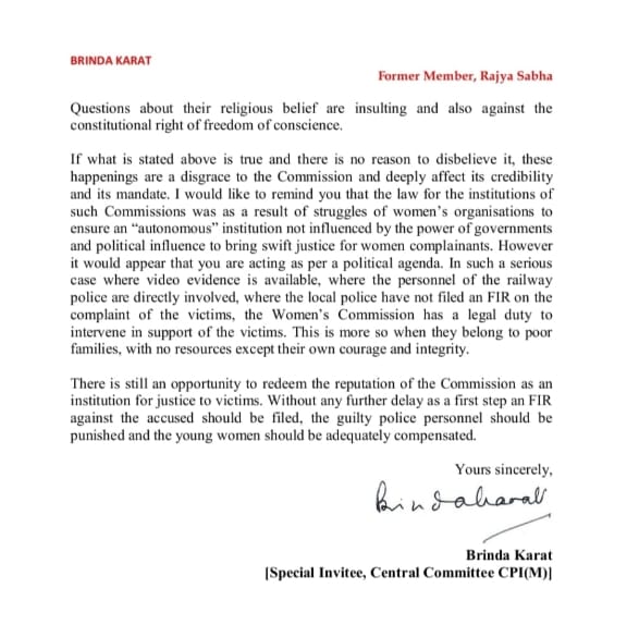 рдпрджрд┐ рдКрдкрд░ рдХрд╣реА рдЧрдИ рдмрд╛рддреЗрдВ рд╕рдЪ рд╣реИрдВ рдФрд░ рдЗрд╕ рдкрд░ рдЕрд╡рд┐рд╢реНрд╡рд╛рд╕ рдХрд░рдиреЗ рдХрд╛ рдХреЛрдИ рдХрд╛рд░рдг рдирд╣реАрдВ рд╣реИ, рддреЛ рдпреЗ рдШрдЯрдирд╛рдПрдБ рдЖрдпреЛрдЧ рдХреЗ рд▓рд┐рдП рдХрд▓рдВрдХ рд╣реИрдВ рдФрд░ рдЗрд╕рдХреА рд╡рд┐рд╢реНрд╡рд╕рдиреАрдпрддрд╛ рдФрд░ рдЗрд╕рдХреЗ рдЕрдзрд┐рджреЗрд╢ рдХреЛ рдЧрд╣рд░рд╛рдИ рд╕реЗ рдкреНрд░рднрд╛рд╡рд┐рдд рдХрд░рддреА рд╣реИрдВред рдореИрдВ рдЖрдкрдХреЛ рдпрд╛рдж рджрд┐рд▓рд╛рдирд╛ рдЪрд╛рд╣реВрдБрдЧреА рдХрд┐ рдРрд╕реЗ рдЖрдпреЛрдЧреЛрдВ рдХреЗ рд╕реНрдерд╛рдкрдирд╛ рдХреЗ рд▓рд┐рдП рдХрд╛рдиреВрди рдХрд╛ рдмрдирдирд╛ рдорд╣рд┐рд▓рд╛ рд╕рдВрдЧрдардиреЛрдВ рдХреЗ рд╕рдВрдШрд░реНрд╖реЛрдВ рдХрд╛ рдкрд░рд┐рдгрд╛рдо рдерд╛, рддрд╛рдХрд┐ рдорд╣рд┐рд▓рд╛ рд╢рд┐рдХрд╛рдпрддрдХрд░реНрддрд╛рдУрдВ рдХреЛ рддреНрд╡рд░рд┐рдд рдиреНрдпрд╛рдп рджрд┐рд▓рд╛рдиреЗ рдХреЗ рд▓рд┐рдП рдПрдХ “рд╕реНрд╡рд╛рдпрддреНрдд” рд╕рдВрд╕реНрдерд╛ рд╕реБрдирд┐рд╢реНрдЪрд┐рдд рдХреА рдЬрд╛ рд╕рдХреЗ, рдЬреЛ рд╕рд░рдХрд╛рд░реЛрдВ рдХреА рд╢рдХреНрддрд┐ рдФрд░ рд░рд╛рдЬрдиреАрддрд┐рдХ рдкреНрд░рднрд╛рд╡ рд╕реЗ рдкреНрд░рднрд╛рд╡рд┐рдд рди рд╣реЛред рдмрд╣рд░рд╣рд╛рд▓, рдРрд╕рд╛ рдкреНрд░рддреАрдд рд╣реЛрддрд╛ рд╣реИ рдХрд┐ рдЖрдк рдПрдХ рд░рд╛рдЬрдиреАрддрд┐рдХ рдПрдЬреЗрдВрдбреЗ рдХреЗ рдЕрдиреБрд╕рд╛рд░ рдХрд╛рдо рдХрд░ рд░рд╣реЗ рд╣реИрдВред рдРрд╕реЗ рдЧрдВрднреАрд░ рдорд╛рдорд▓реЗ рдореЗрдВ рдЬрд╣рд╛рдВ рд╡реАрдбрд┐рдпреЛ рд╕рд╛рдХреНрд╖реНрдп рдЙрдкрд▓рдмреНрдз рд╣реИрдВ, рдЬрд╣рд╛рдВ рд░реЗрд▓рд╡реЗ рдкреБрд▓рд┐рд╕ рдХреЗ рдХрд░реНрдорд┐рдпреЛрдВ рдХреА рд╕реАрдзреА рд╕рдВрд▓рдЧреНрдирддрд╛ рд╣реИрдВ, рдЬрд╣рд╛рдВ рд╕реНрдерд╛рдиреАрдп рдкреБрд▓рд┐рд╕ рдиреЗ рдкреАрдбрд╝рд┐рддреЛрдВ рдХреА рд╢рд┐рдХрд╛рдпрдд рдкрд░ рдкреНрд░рд╛рдердорд┐рдХреА рджрд░реНрдЬ рдирд╣реАрдВ рдХреА рд╣реИ, рдорд╣рд┐рд▓рд╛ рдЖрдпреЛрдЧ рдХрд╛ рдХрд╛рдиреВрдиреА рдХрд░реНрддрд╡реНрдп рд╣реИ рдХрд┐ рд╡рд╣ рдкреАрдбрд╝рд┐рддреЛрдВ рдХреЗ рд╕рдорд░реНрдерди рдореЗрдВ рд╣рд╕реНрддрдХреНрд╖реЗрдк рдХрд░реЗред рдпрд╣ рддрдм рдФрд░ рднреА рдЬреНрдпрд╛рджрд╛ рдЬрд░реВрд░реА рд╣реИ, рдЬрдм рд╡реЗ рдЧрд░реАрдм рдкрд░рд┐рд╡рд╛рд░реЛрдВ рд╕реЗ рддрд╛рд▓реНрд▓реБрдХ рд░рдЦрддреЗ рд╣реИрдВ, рдЬрд┐рдирдХреЗ рдкрд╛рд╕ рдЕрдкрдиреЗ рд╕рд╛рд╣рд╕ рдФрд░ рдИрдорд╛рдирджрд╛рд░реА рдХреЗ рдЕрд▓рд╛рд╡рд╛ рдХреЛрдИ рддрд╛рдХрдд рдирд╣реАрдВ рд╣реИред