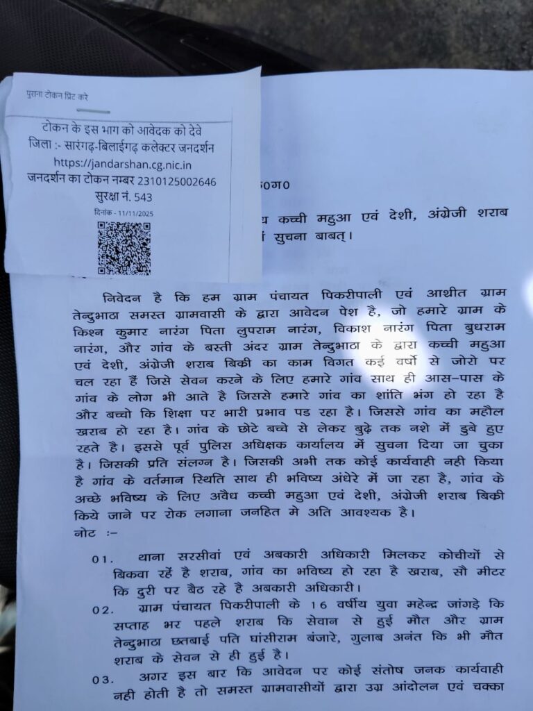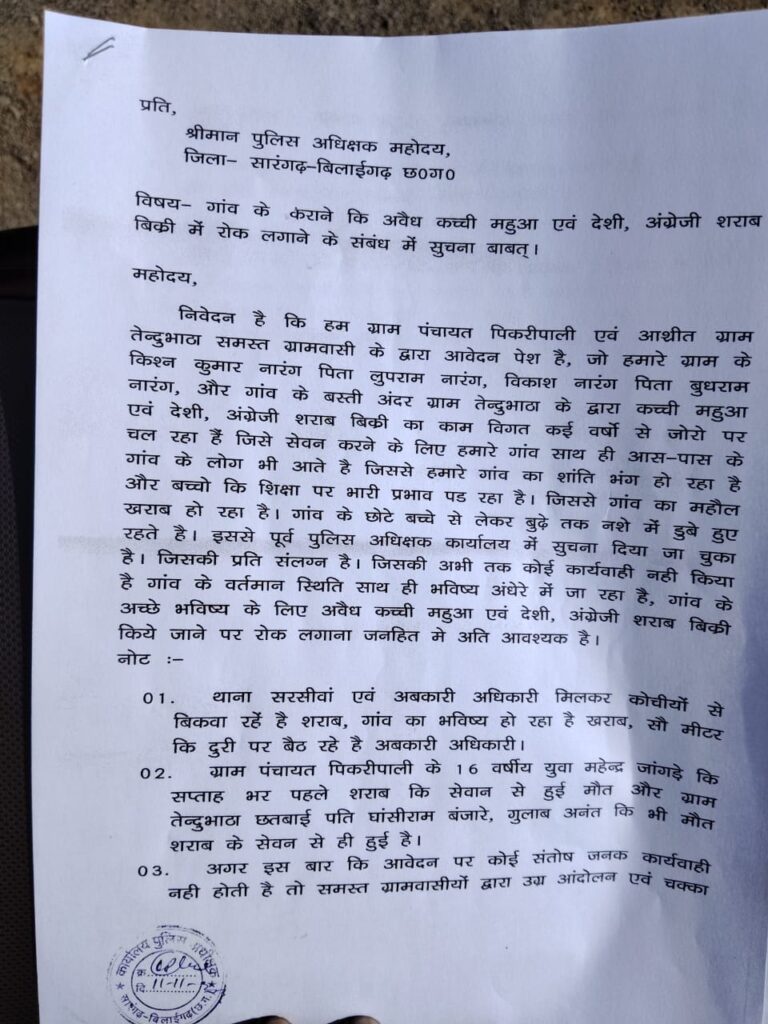 рдЧреНрд░рд╛рдореАрдгреЛрдВ рджреНрд╡рд╛рд░рд╛ рдкреНрд░рд╕реНрддреБрдд рдЖрд╡реЗрджрди рдореЗрдВ рдХрд╣рд╛ рдЧрдпрд╛ рд╣реИ рдХрд┐ рдЧрд╛рдВрд╡ рдХреЗ рд╣реА рдХреБрдЫ рд▓реЛрдЧ, рдЬрд┐рдирдореЗрдВ рдХрд┐рд╢рди рдХреБрдорд╛рд░ рдирд╛рдпрдХ рдкрд┐рддрд╛ рдмрд┐рд╕рд░рд╛рдо рдирд╛рдпрдХ, рд╡рд┐рдХрд╛рд╕ рдХреБрдорд╛рд░ рдкрд┐рддрд╛ рдмреБрдбрд░рд╛рдо рдирд╛рдпрдХ рдФрд░ рдЕрдиреНрдп рд▓реЛрдЧ рд╢рд╛рдорд┐рд▓ рд╣реИрдВ, рдЕрд╡реИрдз рд░реВрдк рд╕реЗ рд╢рд░рд╛рдм рдмрд┐рдХреНрд░реА рдХрд╛ рдзрдВрдзрд╛ рдХрд░ рд░рд╣реЗ рд╣реИрдВред рдЗрди рд▓реЛрдЧреЛрдВ рдХреЗ рдХрд╛рд░рдг рдкреВрд░реЗ рдЧрд╛рдВрд╡ рдореЗрдВ рдХрдЪреНрдЪреА рдорд╣реБрдЖ рд╢рд░рд╛рдм рдФрд░ рдЕрдВрдЧреНрд░реЗрдЬреА рд╢рд░рд╛рдм рдХреА рдЕрд╡реИрдз рдмрд┐рдХреНрд░реА рд▓рдЧрд╛рддрд╛рд░ рдЪрд▓ рд░рд╣реА рд╣реИ, рдЬрд┐рд╕рд╕реЗ рд╕рдорд╛рдЬ рдореЗрдВ рдЕрд╕рд╛рдорд╛рдЬрд┐рдХ рдЧрддрд┐рд╡рд┐рдзрд┐рдпреЛрдВ рдХреЛ рдмрдврд╝рд╛рд╡рд╛ рдорд┐рд▓ рд░рд╣рд╛ рд╣реИред рдЧрд╛рдВрд╡ рдХреЗ рд▓реЛрдЧ рдЗрд╕ рдирд╢реЗ рдХреА рд╡рдЬрд╣ рд╕реЗ рдЭрдЧрдбрд╝реЛрдВ, рд╡рд┐рд╡рд╛рджреЛрдВ рдФрд░ рдШрд░реЗрд▓реВ рдХрд▓рд╣ рдореЗрдВ рдЙрд▓рдЭрддреЗ рдЬрд╛ рд░рд╣реЗ рд╣реИрдВред