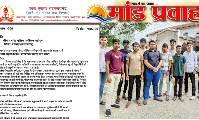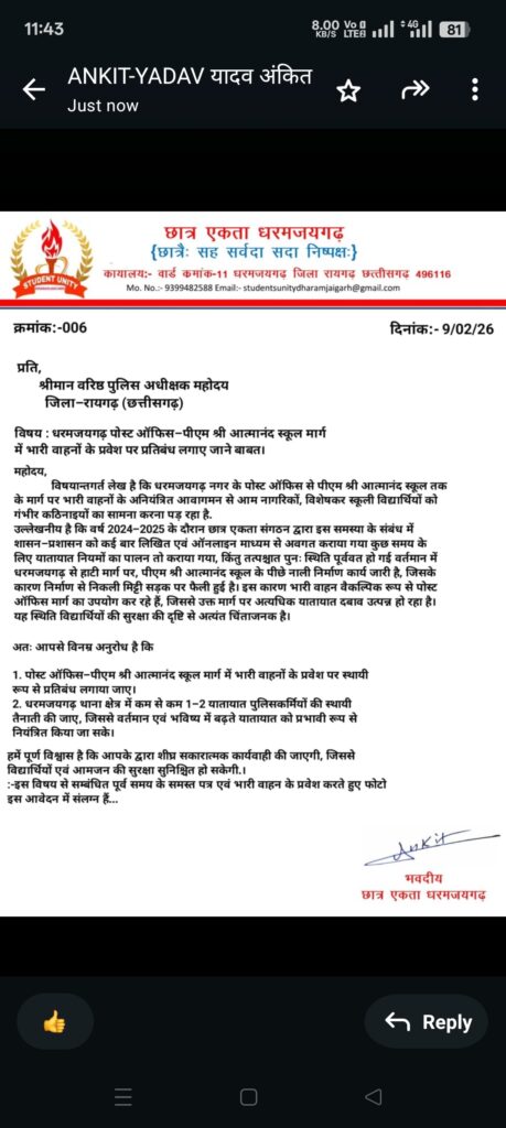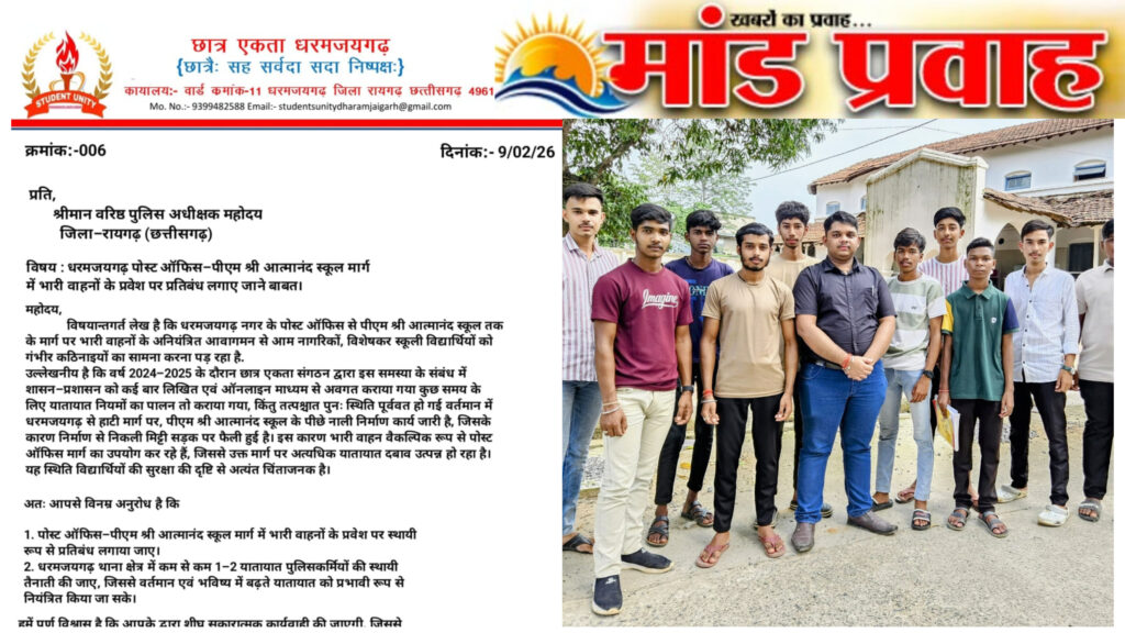 рдЗрд╕ рдЧрдВрднреАрд░ рд╕рдорд╕реНрдпрд╛ рдХреЛ рд▓реЗрдХрд░ рдЫрд╛рддреНрд░ рдПрдХрддрд╛ рд╕рдВрдШ рдзрд░рдордЬрдпрдЧрдврд╝ рдиреЗ рд╕реЛрдорд╡рд╛рд░ рдХреЛ рдЬрд┐рд▓рд╛ рдХреЗ рд╡рд░рд┐рд╖реНрда рдкреБрд▓рд┐рд╕ рдЕрдзреАрдХреНрд╖рдХ рд░рд╛рдпрдЧрдврд╝ рдХреЛ рдЬреНрдЮрд╛рдкрди рд╕реМрдВрдкрддреЗ рд╣реБрдП рддрддреНрдХрд╛рд▓ рдФрд░ рд╕реНрдерд╛рдпреА рдХрд╛рд░реНрд░рд╡рд╛рдИ рдХреА рдорд╛рдВрдЧ рдХреА рд╣реИред