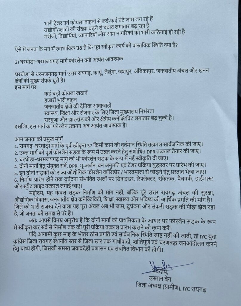 рдЬреНрдЮрд╛рдкрди рдореЗрдВ рдмрддрд╛рдпрд╛ рдЧрдпрд╛ рдХрд┐ рд░рд╛рдпрдЧрдврд╝тАУрдШрд░рдШреЛрдбрд╝рд╛ (37 рдХрд┐рдореА) рдлреЛрд░рд▓реЗрди рд╕рдбрд╝рдХ рдХреЗ рд▓рд┐рдП рдХрд░реАрдм тВ╣17.30 рдХрд░реЛрдбрд╝ рдХреА рдкреНрд░рд╛рд░рдВрднрд┐рдХ рд╕реНрд╡реАрдХреГрддрд┐ рдорд┐рд▓ рдЪреБрдХреА рд╣реИ, рд▓реЗрдХрд┐рди рдЕрдм рддрдХ рдирд┐рд░реНрдорд╛рдг рдХрд╛рд░реНрдп рд╢реБрд░реВ рдирд╣реАрдВ рд╣реБрдЖред