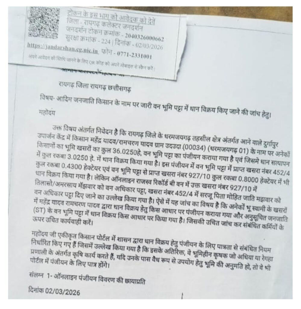 рдмрддрд╛рдпрд╛ рдЬрд╛ рд░рд╣рд╛ рд╣реИ рдХрд┐ рд╢рд╛рд╕рди рджреНрд╡рд╛рд░рд╛ рдзрд╛рди рдЦрд░реАрджреА рдкреНрд░рдХреНрд░рд┐рдпрд╛ рдХреЛ рдкрд╛рд░рджрд░реНрд╢реА рдмрдирд╛рдиреЗ рдХреЗ рд▓рд┐рдП рд╕рдорд┐рддрд┐рдпреЛрдВ рдХрд╛ рдЧрдарди рдХрд┐рдпрд╛ рдЧрдпрд╛ рд╣реИ, рд▓реЗрдХрд┐рди рдЗрд╕рдХреЗ рдмрд╛рд╡рдЬреВрдж рдзрд░рдордЬрдпрдЧрдврд╝ рдореЗрдВ рдирд┐рдпрдореЛрдВ рдХреА рдЦреБрд▓рдХрд░ рдзрдЬреНрдЬрд┐рдпрд╛рдВ рдЙрдбрд╝рд╛рдИ рдЬрд╛ рд░рд╣реА рд╣реИрдВред рддрд╛рдЬрд╛ рдорд╛рдорд▓рд╛ рджреБрд░реНрдЧрд╛рдкреБрд░ рдзрд╛рди рдЙрдкрд╛рд░реНрдЬрди рдХреЗрдВрджреНрд░ рд╕реЗ рдЬреБрдбрд╝рд╛ рд╣реИ, рдЬрд╣рд╛рдВ рдЙрджрдЙрджрд╛ рдирд┐рд╡рд╛рд╕реА рдорд╣реЗрдиреНрджреНрд░ рдпрд╛рджрд╡ (рдкрд┐рддрд╛ рд░рд╛рдордЪрд░рдг рдпрд╛рджрд╡) рджреНрд╡рд╛рд░рд╛ рдХрдерд┐рдд рд░реВрдк рд╕реЗ рдлрд░реНрдЬреА рддрд░реАрдХреЗ рд╕реЗ рдХрдИ рдПрдХрдбрд╝ рднреВрдорд┐ рдХрд╛ рдкрдВрдЬреАрдпрди рдХрд░ рдзрд╛рди рдмреЗрдЪрдиреЗ рдХрд╛ рдорд╛рдорд▓рд╛ рд╕рд╛рдордиреЗ рдЖрдпрд╛ рд╣реИред