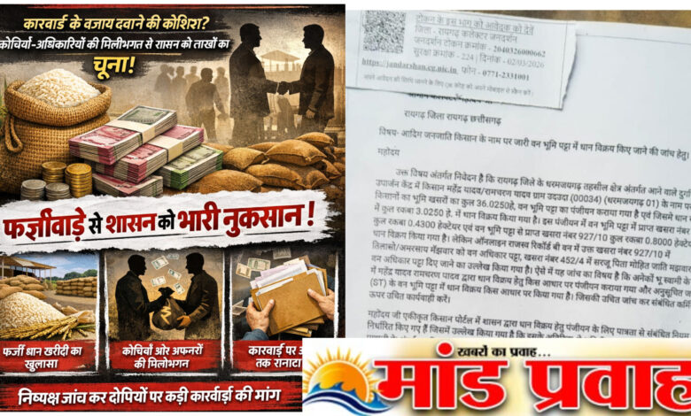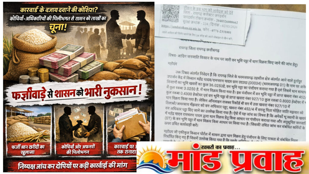 рдзрд░рдордЬрдпрдЧрдврд╝ рдХреНрд╖реЗрддреНрд░ рдореЗрдВ рдзрд╛рди рдЦрд░реАрджреА рдореЗрдВ рдмрдбрд╝реЗ рдлрд░реНрдЬреАрд╡рд╛рдбрд╝реЗ рдХрд╛ рдорд╛рдорд▓рд╛ рд╕рд╛рдордиреЗ рдЖрдиреЗ рдХреЗ рдмрд╛рдж рднреА рд╕рдВрдмрдВрдзрд┐рдд рдЕрдзрд┐рдХрд╛рд░рд┐рдпреЛрдВ рдХреА рдЪреБрдкреНрдкреА рдХрдИ рд╕рд╡рд╛рд▓ рдЦрдбрд╝реЗ рдХрд░ рд░рд╣реА рд╣реИред рд╕реНрдерд┐рддрд┐ рдпрд╣ рд╣реИ рдХрд┐ рдХрд╛рд░реНрд░рд╡рд╛рдИ рдХрд░рдиреЗ рдХреЗ рдмрдЬрд╛рдп рдорд╛рдорд▓реЗ рдХреЛ рджрдмрд╛рдиреЗ рдХреА рдХреЛрд╢рд┐рд╢ рдХрд┐рдП рдЬрд╛рдиреЗ рдХреЗ рдЖрд░реЛрдк рд▓рдЧ рд░рд╣реЗ рд╣реИрдВ, рдЬрд┐рд╕рд╕реЗ рдЖрдо рд▓реЛрдЧреЛрдВ рдореЗрдВ рдирд╛рд░рд╛рдЬрдЧреА рдмрдврд╝рддреА рдЬрд╛ рд░рд╣реА рд╣реИред