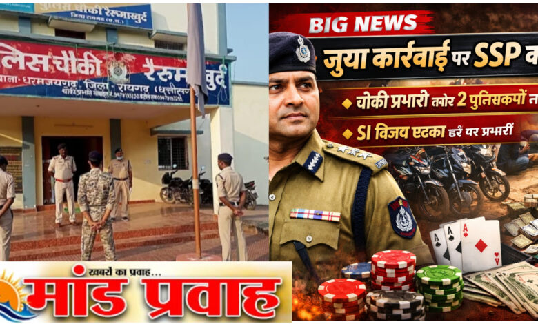 рд░рд╛рдпрдЧрдврд╝ рдЬрд┐рд▓реЗ рдореЗрдВ рдЬреБрдЖ рдЧрддрд┐рд╡рд┐рдзрд┐рдпреЛрдВ рдкрд░ рдХрд╛рд░реНрд░рд╡рд╛рдИ рдореЗрдВ рд▓рд╛рдкрд░рд╡рд╛рд╣реА рдмрд░рддрдиреЗ рд╡рд╛рд▓реЗ рдкреБрд▓рд┐рд╕рдХрд░реНрдорд┐рдпреЛрдВ рдкрд░ рдХрдбрд╝реА рдХрд╛рд░реНрд░рд╡рд╛рдИ рдХреА рдЧрдИ рд╣реИред рд╡рд░рд┐рд╖реНрда рдкреБрд▓рд┐рд╕ рдЕрдзреАрдХреНрд╖рдХ (SSP) рд╢рд╢рд┐ рдореЛрд╣рди рд╕рд┐рдВрд╣ рдиреЗ рдорд╛рдорд▓реЗ рдХреЛ рдЧрдВрднреАрд░рддрд╛ рд╕реЗ рд▓реЗрддреЗ рд╣реБрдП рдЪреМрдХреА рд░реИрд░реВрдорд╛рдЦреБрд░реНрдж рдХреЗ рдкреНрд░рднрд╛рд░реА рдПрдПрд╕рдЖрдИ рдмреГрдЬ рдХрд┐рд╢реЛрд░ рдЧрд┐рд░реА рдФрд░ рдмреАрдЯ рдкреНрд░рдзрд╛рди рдЖрд░рдХреНрд╖рдХ рд▓рдХреНрд╖реНрдореА рдирд╛рд░рд╛рдпрдг рдХреЗрдВрд╡рдЯ рдХреЛ рддрддреНрдХрд╛рд▓ рдкреНрд░рднрд╛рд╡ рд╕реЗ рд▓рд╛рдЗрди рдЕрдЯреИрдЪ рдХрд░ рджрд┐рдпрд╛ рд╣реИред