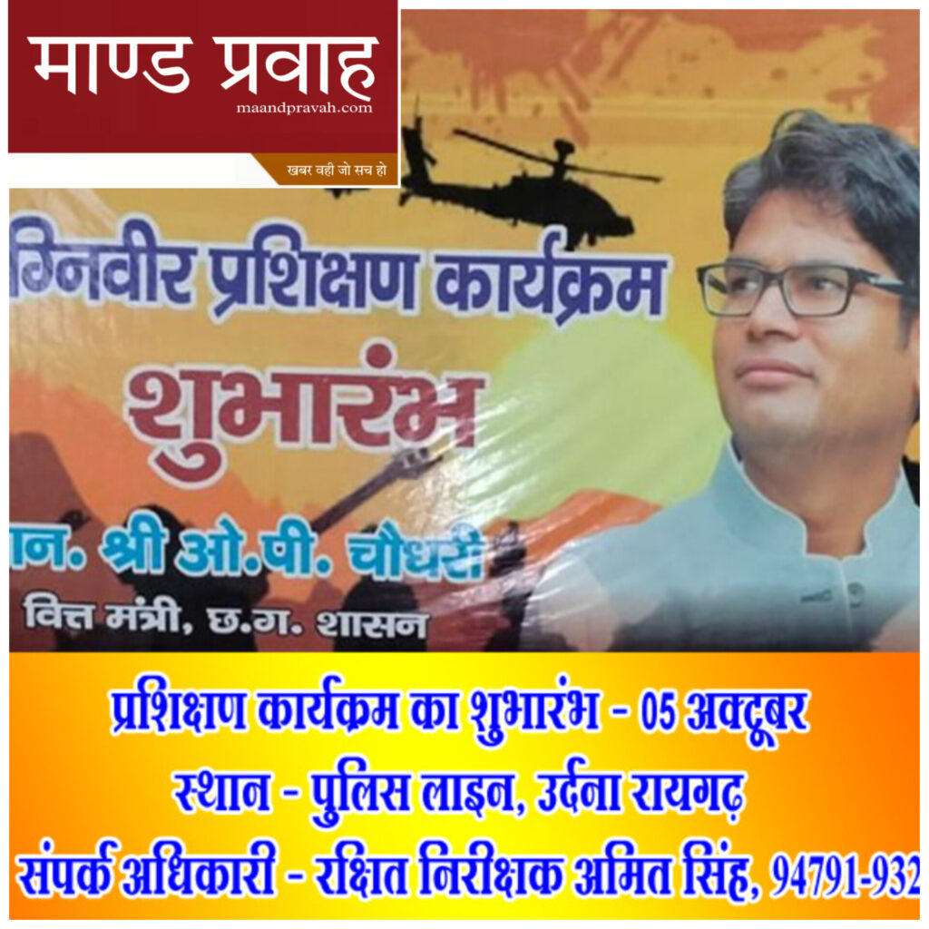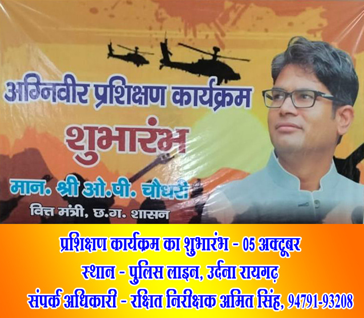 इस संबंध में वित्त मंत्री ओपी चौधरी सर द्वारा अधिकारियों को निर्देश दिए गए हैं। जिला प्रशासन और पुलिस द्वारा “अग्निवीर” योजना में चयनित होने की तैयारी कर रहे युवाओं के लिए इस वर्ष भी पुलिस लाइन उर्दना में नि:शुल्क विशेष प्रशिक्षण शिविर आयोजित किया जावेगा । यहां देखें वीडियो…..👇👇